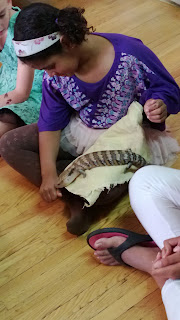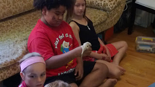 For her birthday she wanted to have a critter party, with LIVE critters. So I went on a search and found this great place called Creature Quest. The rep from the company comes to the house with a number of selected creatures and critters. Perfect! So my daughter made her list of creatures, including a hedgehog, tree frog and a blue tongued skink.