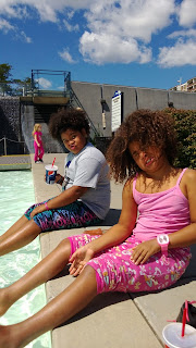 The girls being silly sitting by the pool